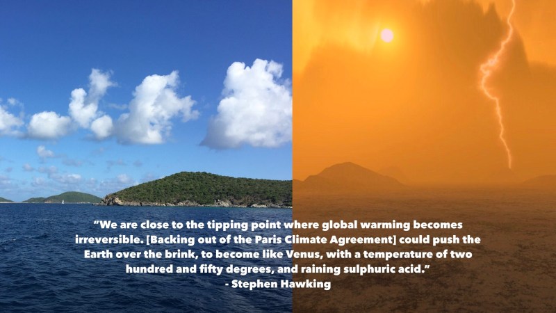We are close to the tipping point where global warming becomes irreversible. [Backing out of the Paris Agreement] could push the Earth over the brink, to become like Venus, with a temperature of two hundred and fifty degrees, and raining sulphuric acid.